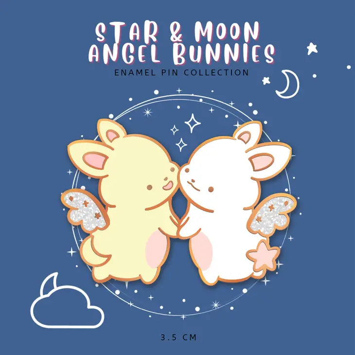 This pin is designed as friendship pin with fun designs of one bunny with moon tail and the other with star tail as astronomical concept. It has two pink star rubber backs and is made of polished high-quality rose gold-plated metal. It looks adorable on your hat, backpack, jacket, sweater, or pinboard! A cute little gift for friends or families.