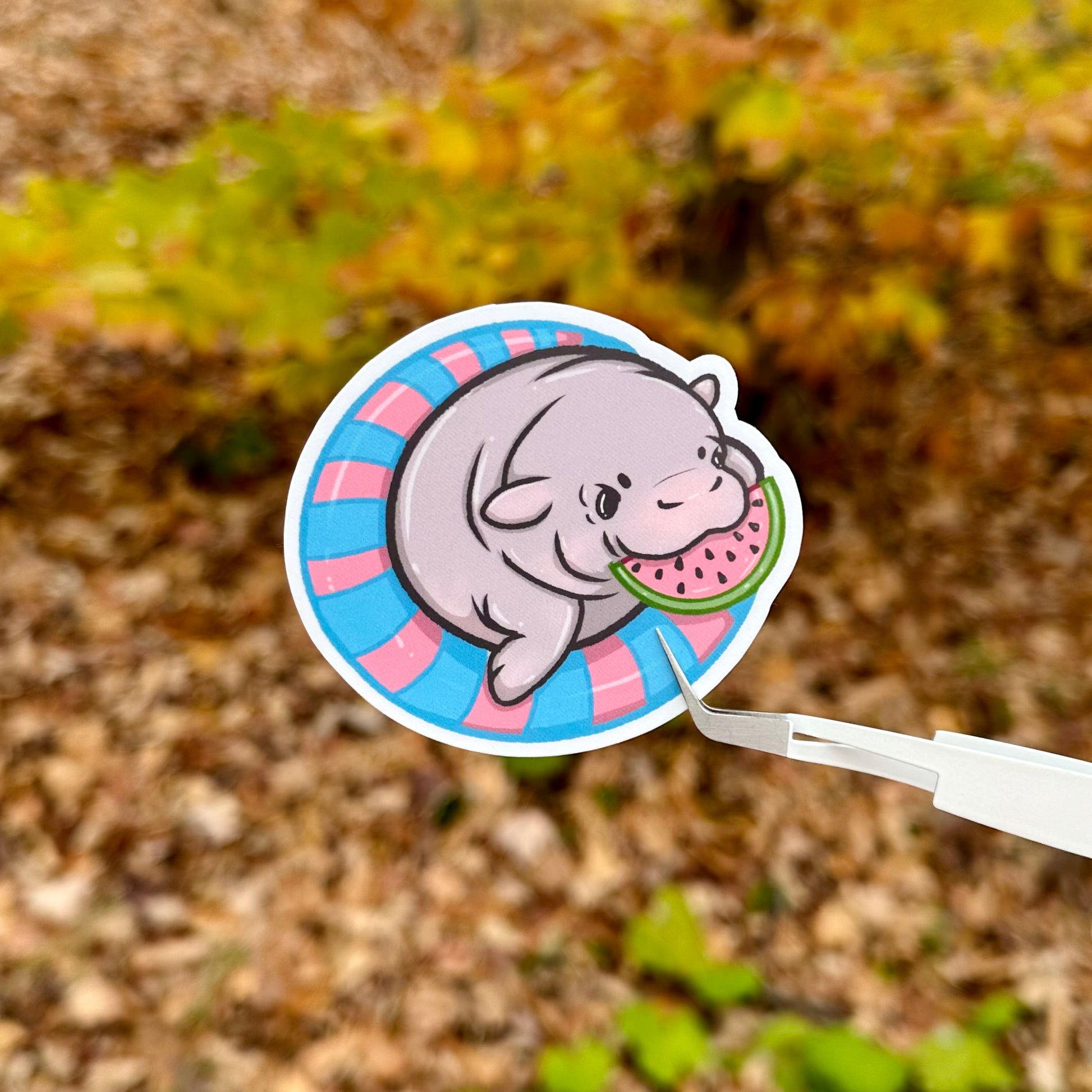On this sticker, Moo Deng is wearing a buoy and eating a watermelon slice 🍉