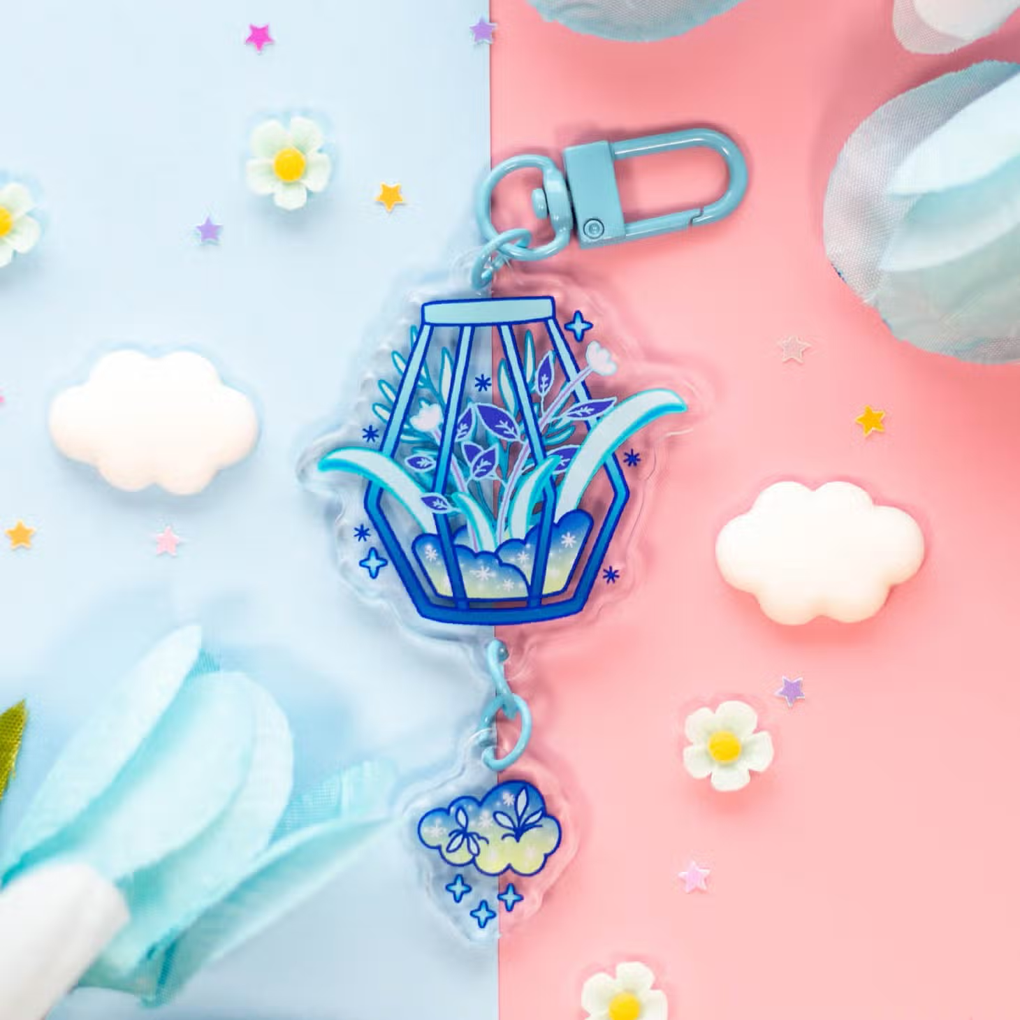 - Size (WxH): Top keychain approximately 2 in x 2 in, bottom keychain .75 in x 1 in